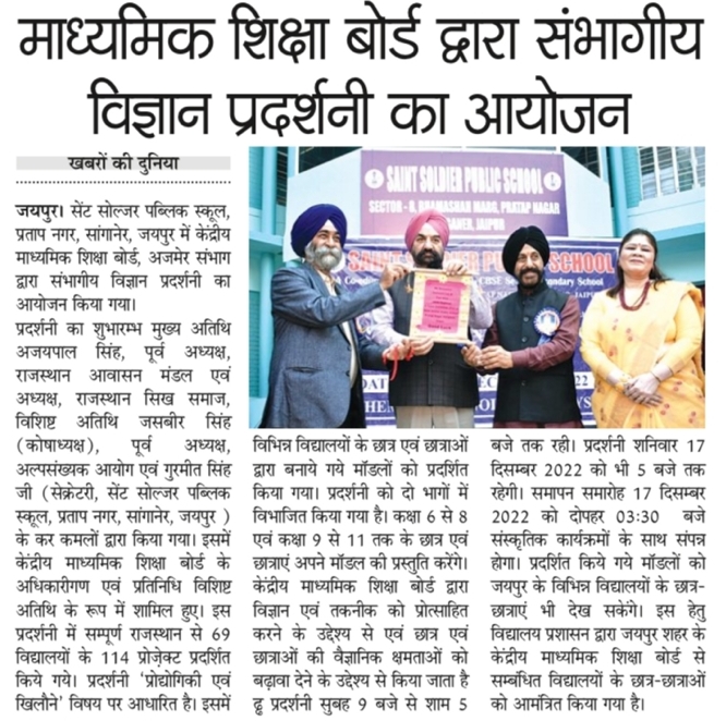 जयपुर। सेंट सोल्जर पब्लिक स्कूल, प्रताप नगर, सांगानेर, जयपुर में केंद्रीय माध्यमिक शिक्षा बोर्ड, अजमेर संभाग द्वारा संभागीय विज्ञान प्रदर्शनी का आयोजन किया गया। प्रदर्शनी का शुभारम्भ मुख्य अतिथि अजयपाल सिंह, पूर्व अध्यक्ष, राजस्थान आवासन मंडल एवं अध्यक्ष, राजस्थान सिख समाज, विशिष्ट अतिथि जसबीर सिंह (कोषाध्यक्ष), पूर्व अध्यक्ष अल्पसंख्यक आयोग एवं गुरमीत सिंह जी (सेक्रेटरी, सेंट सोल्जर पब्लिक स्कूल, प्रताप नगर, सांगानेर, जयपुर) के कर कमलों द्वारा किया गया। इसमें केंद्रीय माध्यमिक शिक्षा बोर्ड के अधिकारीगण एवं प्रतिनिधि विशिष्ट अतिथि के रूप में शामिल हुए। इस प्रदर्शनी में सम्पूर्ण राजस्थान से 69 विद्यालयों के 114 प्रोजेक्ट प्रदर्शित किये गये। प्रदर्शनी ‘प्रोद्योगिकी एवं खिलौने' विषय पर आधारित है। इसमें विभिन्न विद्यालयों के छात्र एवं छात्राओं द्वारा बनाये गये मॉडलों को प्रदर्शित किया गया। प्रदर्शनी को दो भागों में विभाजित किया गया है। कक्षा 6 से 8 एवं कक्षा 9 से 11 तक के छात्र एवं छात्राएं अपने मॉडल की प्रस्तुति करेंगे। केंद्रीय माध्यमिक शिक्षा बोर्ड द्वारा विज्ञान एवं तकनीक को प्रोत्साहित करने के उद्देश्य से एवं छात्र एवं छात्राओं की वैज्ञानिक क्षमताओं को बढ़ावा देने के उद्देश्य से किया जाता है प्रदर्शनी सुबह 9 बजे से शाम 5 बजे बजे तक रही । प्रदर्शनी शनिवार 17 दिसम्बर 2022 को भी 5 बजे तक रहेगी। समापन समारोह 17 दिसम्बर 2022 को दोपहर 03:30संस्कृतिक कार्यक्रमों के साथ संपन्न होगा। प्रदर्शित किये गये मॉडलों को जयपुर के विभिन्न विद्यालयों के छात्र- छात्राएं भी देख सकेंगे। इस हेतु विद्यालय प्रशासन द्वारा जयपुर शहर के केंद्रीय माध्यमिक शिक्षा बोर्ड से सम्बंधित विद्यालयों के छात्र-छात्राओं को आमंत्रित किया गया है।